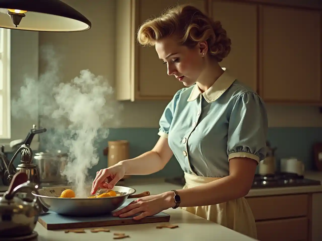 Eine junge, schöne Hausfrau aus den 50er Jahren hat in der Küche anatomisch recht gekocht. Perfekte Finger in der Hand, die Details in der Küche sind unglaublich. Perfekte Komposition und Beleuchtung. Ein scharfer Fokus. Hochkontrast-surrealer Realismus.
