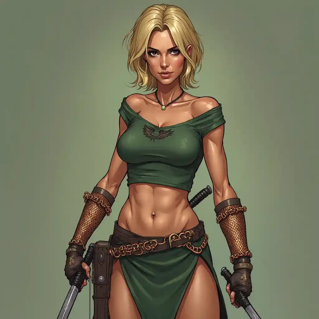 Superschurke, Krieger, Attentäter. Weiß weiblich, mittelgroß, schlank, aber sportlich, wendig und geschickt. Braune Augen (immer aufmerksam), dünne Augenbrauen, mittelmäßiges Aussehen. Die kurzen, sandfarbenen blonden Haare liegen knapp über den Schultern, gefiederte Pony und flauschige Federfrisuren sind in der Mitte abgetrennt. Das schulterfreie Jäger-Grüne Oberteil mit kurzen Ärmeln und einem kupfernen Kettenpanagel-Akzent verrät ihren Bauch. Handgelenkschutz aus Kupfer am Arm. Ein dreieckiges grünes Röckchen des Jägers mit langen Teilen in der Mitte und hohen Seiten der Hüfte, verbunden und gehalten durch einen kupfernen Kettennatter. Der kupferfarbene Eimerstiefel liegt knapp unter den Knien, der mittlere Stiefelabsatz. Sie trägt 2 scharfe Samurai-Schwerter, die unter Strom gesetzt werden, um Ziele zu treffen und sie zu schneiden. Sollte sie körperlichen Angriffen jeglicher Art ausgesetzt sein, übermittelt sie automatisch Abstand zum Angriff. Als ihre Chefs jemanden schnell töten wollten, hätten sie sie geschickt, sagte sie nur allzu gerne zu. Ganzkörperhaltung.