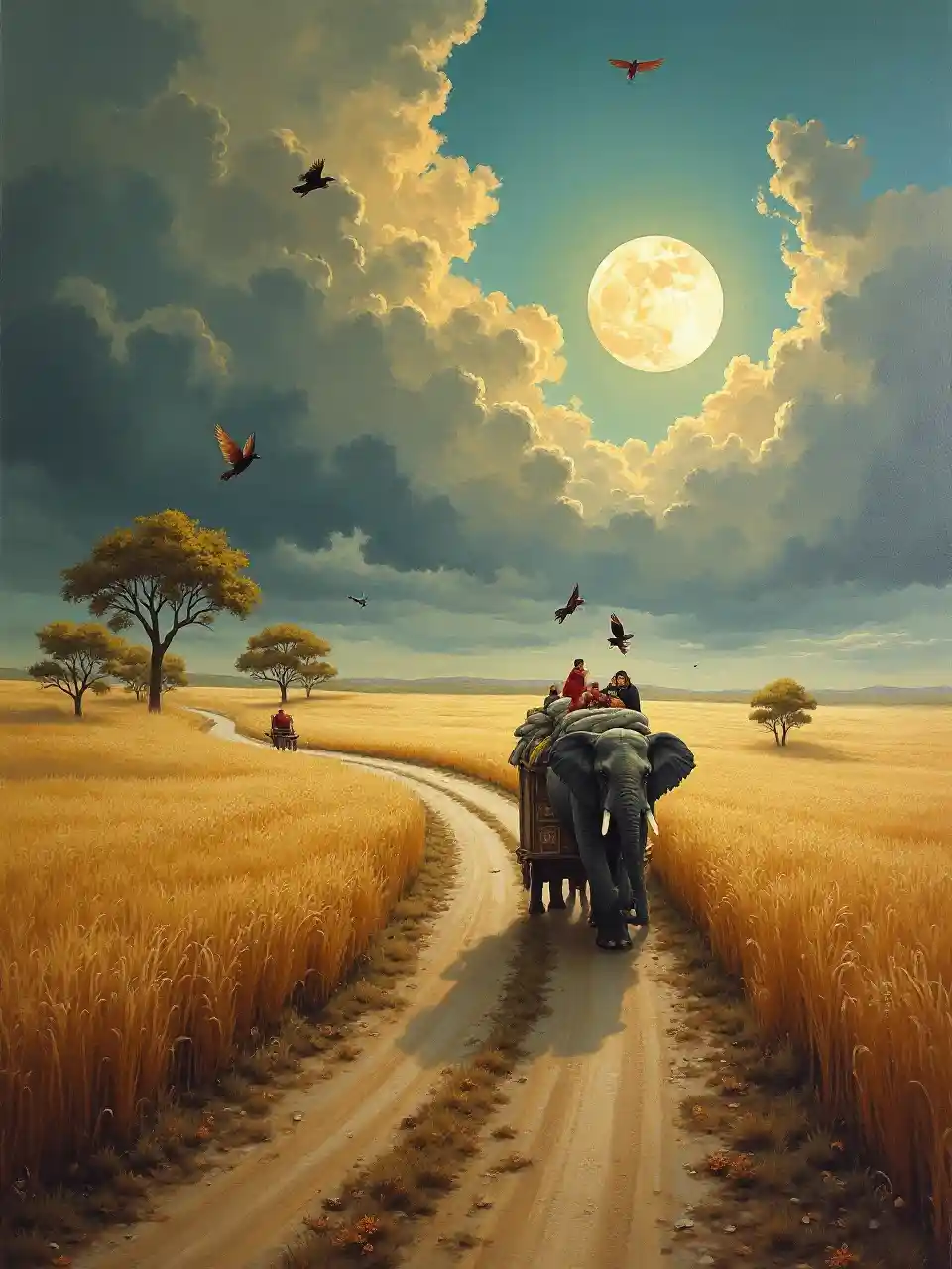 Der starke Wind auf dem Weg weht in die Ferne und beugt die Palmen, die im Weizenfeld wachsen. Unterwegs trägt ein Elefant einen altmodischen Holzwagen mit Säcken mit grauem Getreide und roten Vögeln auf dem Auto. Krähen und gelbe Tauben fliegen an bewölkten Tagen, der Mond scheint, die Sonne geht auf, die Felder werden mit Licht erleuchtet, Impressionismus, Impasto, Fantasie,