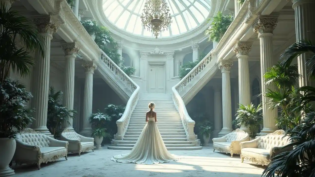 Ein riesiger, verfallener, zerstörter, mit Unkraut bewachsener, riesiger Rotunde mit frostiger und üppiger tropischer Vegetation bedeckter Decke in Form einer Glaskuppel mit prächtigen schmiedeeisernen Gerüsten und einem prächtigen weißen Tanzsaal mit einem riesigen, prächtigen Kristall-Kronleuchter. Elegante, schäbige weiße Polster-Salonsofas und -stühle sind um den Raum herum angeordnet, und eine prächtige, luxuriöse weiße Treppe führt zusammen mit den maroden Stufen ins Innere. Alles ist mit Frost bedeckt. Für ätherische Atmosphäre sorgen Vasen voller gefrorener Blüten und in Eis gehüllte Statuen. Die beiden Tore stehen offen und lassen die Windböen den Schneewirbel im Inneren auf den Boden drücken. Das goldene Sonnenlicht strömt durch offene Türen und hohe Fenster und wirft warme Strahlen auf die eisige Pracht. Auf der prächtigen Treppe steht die Eiskönigin, sie trägt eine schwere weiße Satin- und Spitzenrobe und ihr platinweißes Haar ist zu einer zarten und prächtigen Hochsteckfrisur gekämmt. Dünner Nebel