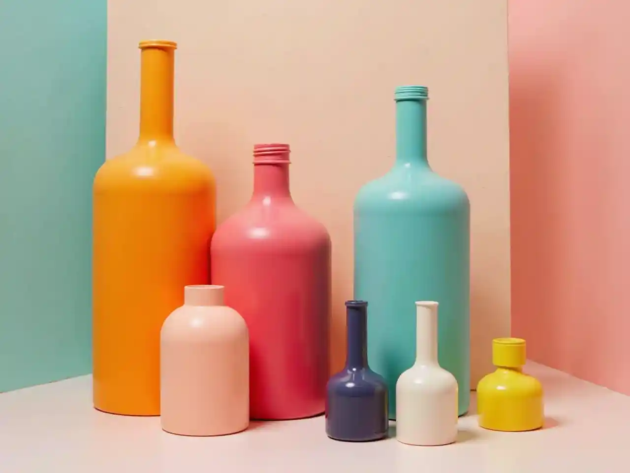 Botellas minimalistas Altas y delgadas de colores vibrantes y degradados inflables con etiqueta minimalista como si fuera dise ñ ada por Virgil abloh。 Coloc á rsela en un set design inspirado en la arquitectura de Luis Barragan。