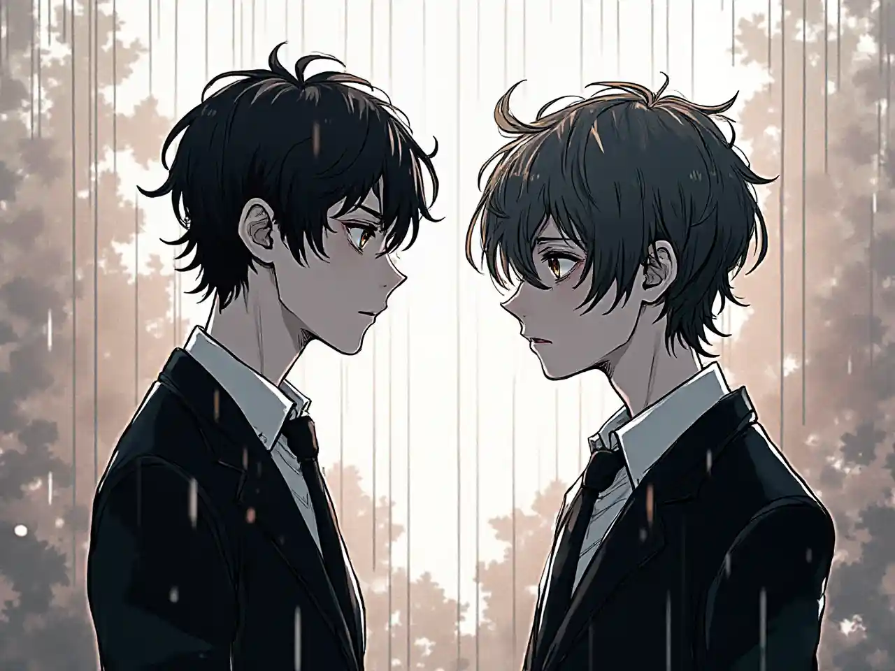 1boy, Silhouette, verblasste Frisur, solo, Tintenregen, seitliches Gesicht, Looking Own, mechancolic Atmosphäre, Krawatte, Eleganz, Bürouniform, solo, ohne Gesicht zu zeigen, ((((sehr kurze Haare))), Meisterwerk, Tusche-Kunststil