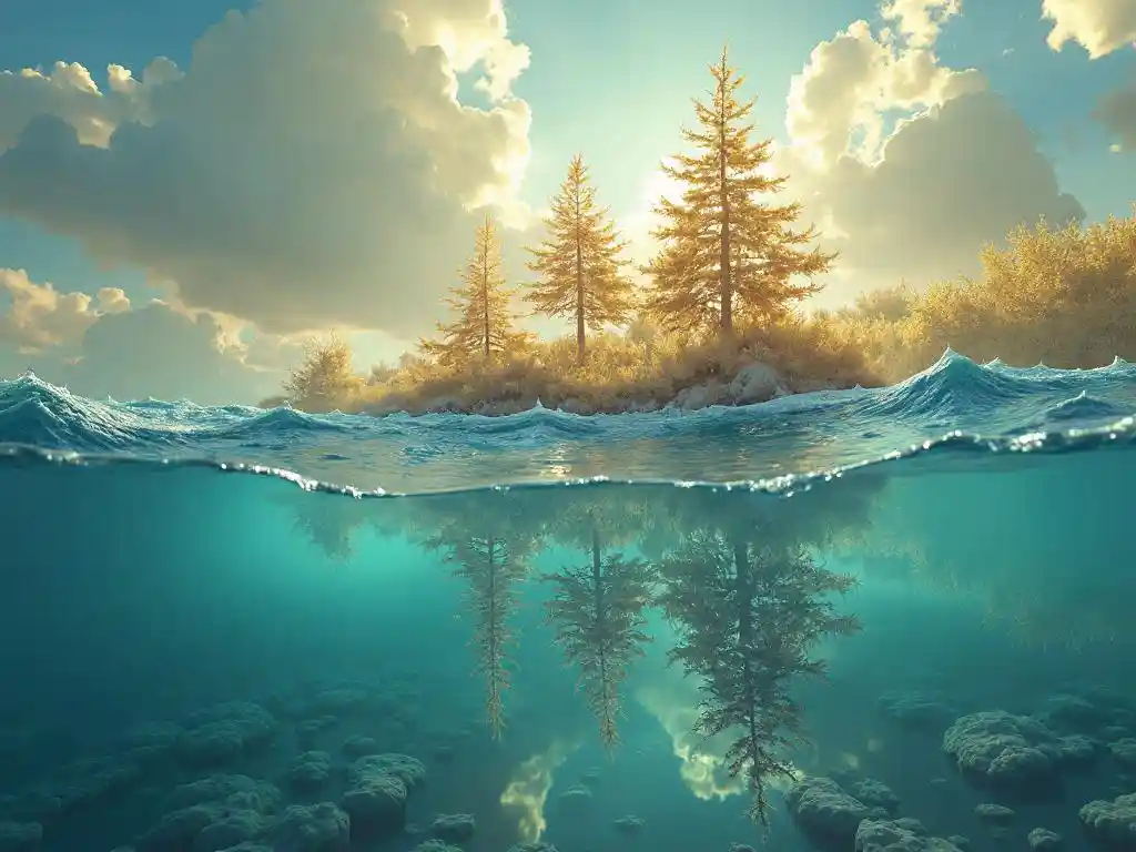 MichaelEine surreale Landschaft, der Himmel ist ein umgekehrtes Meer und goldene Wellen schweben auf einer dunkelblauen Welt. Der Kristallbaum erhebt sich aus dem Boden und reflektiert