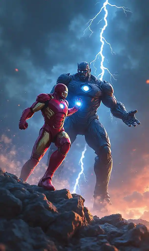 AdalynRealistische Bilder von Iron Mans Kampf gegen Toro am Blitzhimmel zeichnen