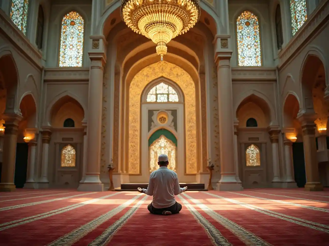 Der muslimische Mann stand und betete namaz, es gibt riesige schöne Moscheen darin, ein Imam führte namaz zum Beten in Mihrab, Mihrab ist breit und schön, auf Mihrab ist ein islamisches Netz geschnitzt, eine Mischung aus modernen und alten Stilen der Moschee, ein riesiger goldener glänzender Kronleuchter, der an der Moschee zum Gebet hängt,