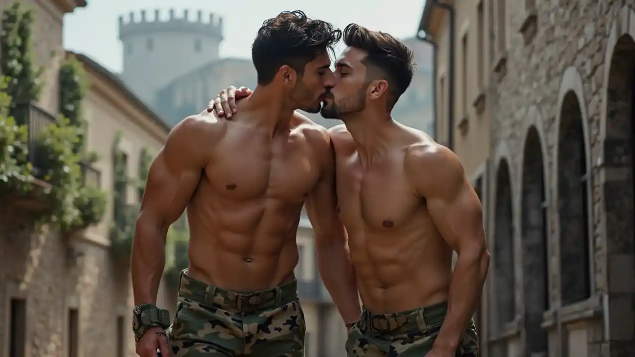 ((gay kiss)), gay-Soldaten, zwei hübsche Typen, (((sehr sexy)) und muskulöse, nackte, dunkelhaarige italienische Soldaten in der italienischen Armee (leidenschaftliche Küsse), ihre Strumpfhosen zeigen eine durchtrainierte sportliche Figur, männliche Models gutaussehende italienische Soldaten, (sehr muskulöse), (perfekte sportliche Figur),