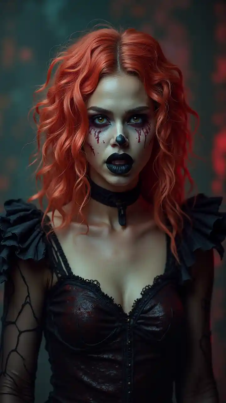 Porträt der bösen Figur von Jennifer Lawrence in einem gruseligen Halloween-Kostüm mit lebendigen Sättigungsfarben, kontrastierenden Farben