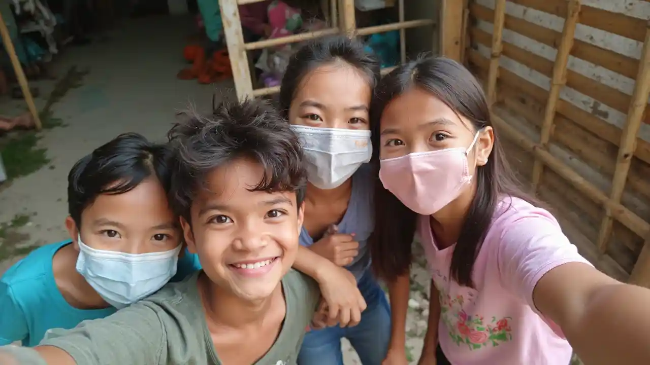 Dicht an dicht posierten die vier jungen Männer für Selfies und strahlten fröhliche Kameradschaft in ungezwungener Umgebung aus. Sie trugen Masken, wahrscheinlich als Reaktion auf Gesundheitsrichtlinien, und der Hintergrund zeigte eine leicht unordentliche Umgebung, die von Bambusstrukturen und einem Hauch von Grün auf dem Boden geprägt war. Die hellen Lichter unterstreichen ihre Mimik, insbesondere den lächelnden Jungen im Vordergrund, dessen verspielte und lässige Kleidung in scharfem Kontrast zu anderen Menschen steht, alle sind sportlich und lebendig und stilistisch. Die Stimmung ist lebendig und unbeschwert und entfaltet einen Moment der Freundschaft und des Spaßes vor einer ungeschminkten, eleganten Kulisse.