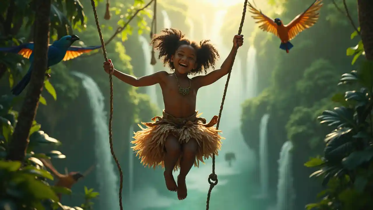 Schwarzes Mädchen schaukelt im Dschungel auf glühenden Seilen