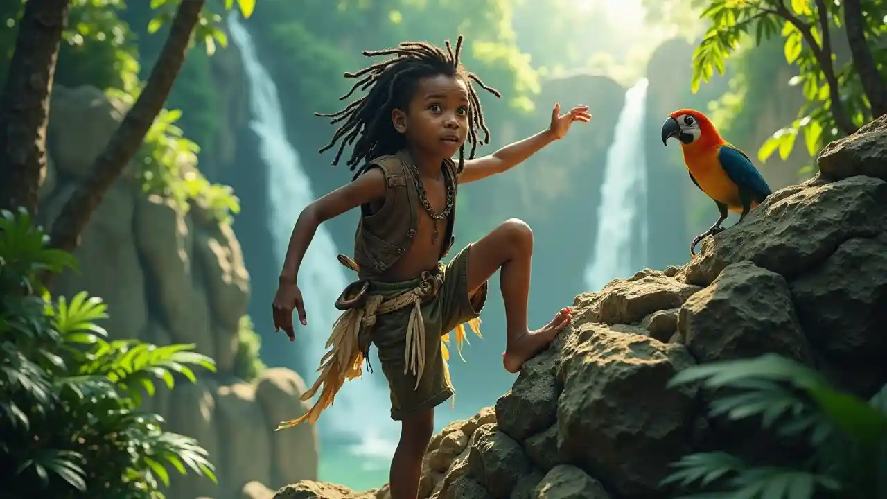 Ein acht Jahre alter schwarzer Junge mit langen Zöpfen klettert im Dschungel auf glühende Felsen und trägt eine Weste mit gefiedertem Akzent. Exotische Vögel und Wasserfälle umrahmen ihn, sein wagemutiger Griff versprüht Mut und wilde Abenteuer in üppiger, fantastischer Umgebung.