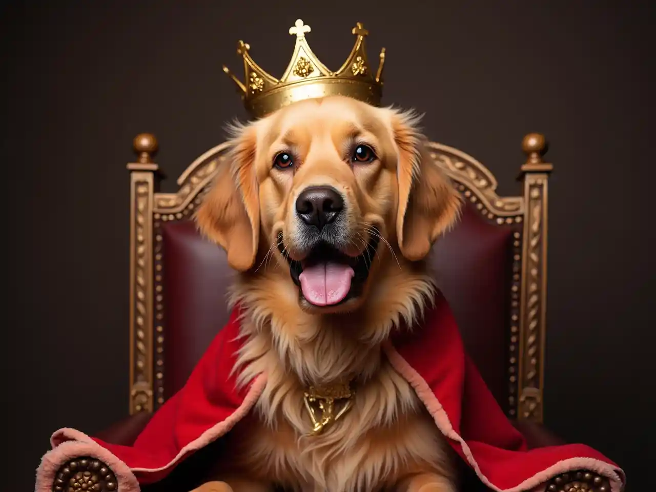 Auf dem Thron sitzt ein als König verkleideter Golden Retriever in roter Robe und Krone auf dem Kopf.