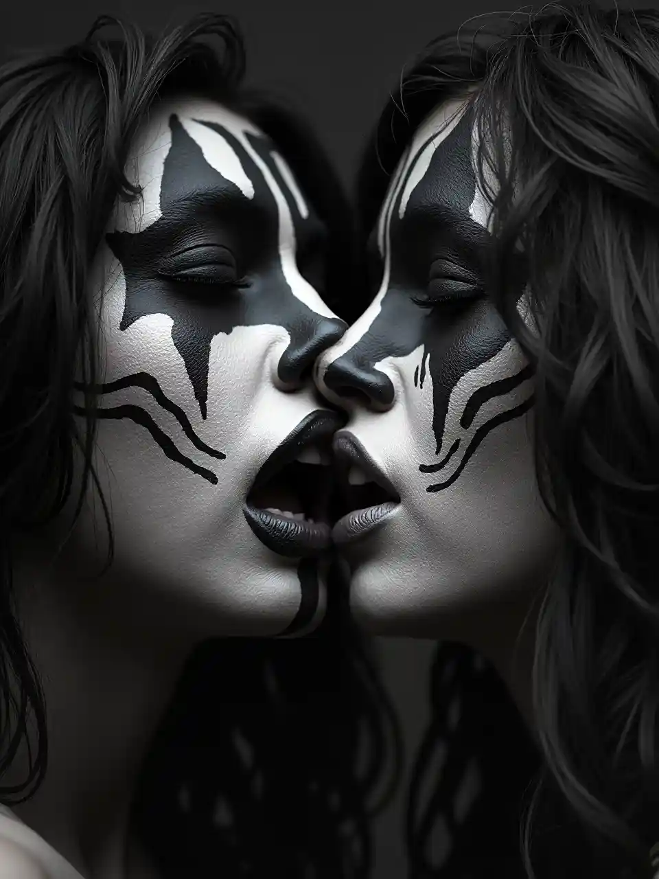EllaRockband Kiss, Gesicht schwarz und weiß lackiert, Studiofoto, professionelles Foto, bunte und satte Farben, detaillierte Bilder, detaillierte Gesichter
