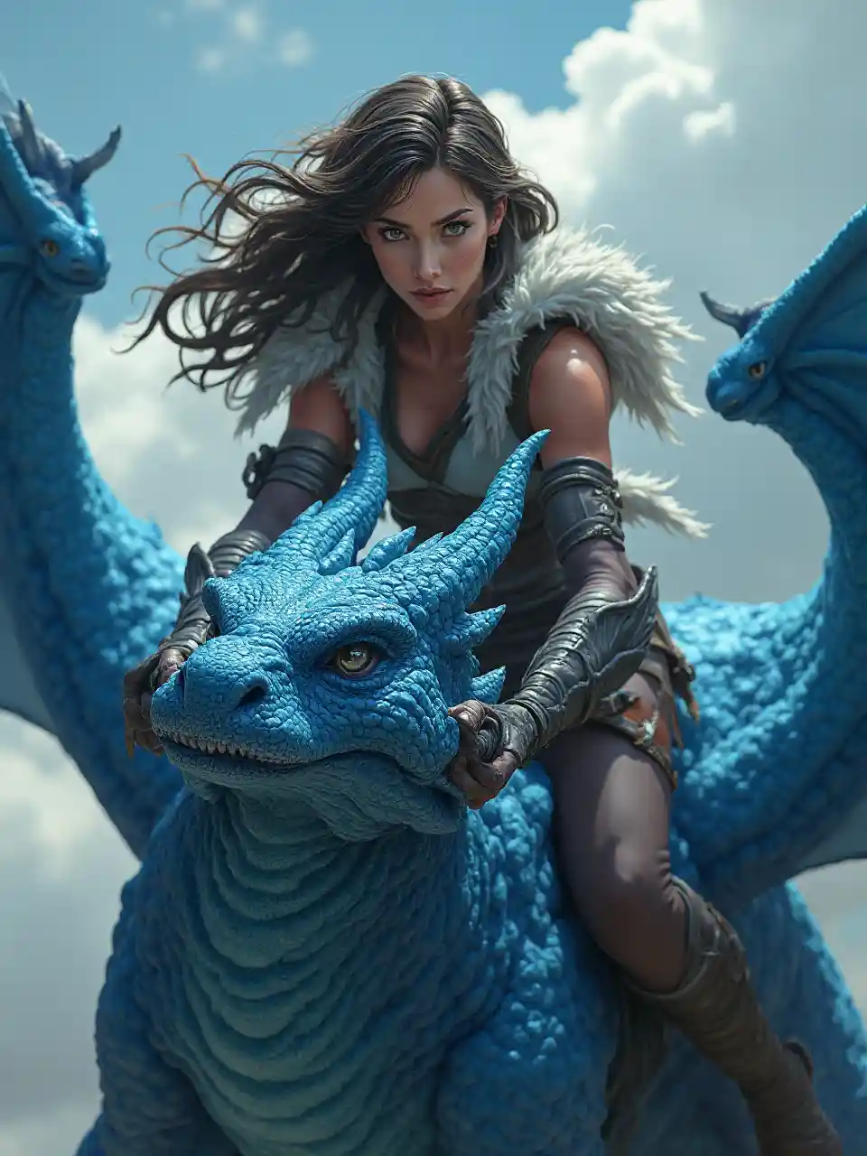 Eine mächtige Frau mit scharfem Blick und Autoritätstemperament kämpft über einen majestätischen blauen Drachen. Sie verkörpert den Charakter von Kitiara aus Dragonlance, einer großartigen menschlichen Kriegerin, die für ihre List und Tapferkeit im Luftkampf bekannt ist. Ihre Haltung strahlt Selbstbewusstsein aus und beherrscht die Fähigkeit, dieses prächtige Wesen unter sich zu kontrollieren. Die Szene ist in atemberaubenden Details eingefangen und zeigt ihre komplizierten Gesichtszüge und ausdrucksstarken Augen, mit dynamischem Himmel im Hintergrund. Inspiriert vom künstlerischen Stil von Jeremy Mann, Sandra Chevrier, Maciej Kuciara, erreichen die Bilder eine realistische 8k-Bildqualität, wobei scharfe, realistische Elemente und echte Schatten den dreidimensionalen Effekt verstärken.