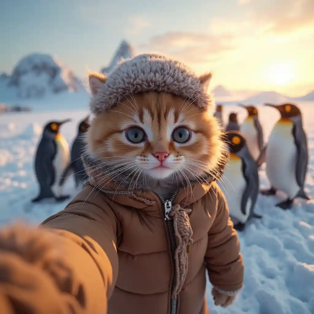 Ein flauschiges Kätzchen mit neugierigen großen Augen in bequemer brauner Daunenjacke und Mütze macht Selfies vor dem Hintergrund schneebedeckter Eisfelder. Der Himmel ist in Sonnenuntergangstönen gemalt und strahlt ein warmes, goldenes Licht durch die ganze Szene. Umgeben von den Kätzchen ist eine quirlige Gruppe von mehr als einem Dutzend kleiner, schwarz-weißer Kaiserpinguine, deren glattes Gefieder im sanften Licht glitzert. Das lange Fell der Katze raschelt sanft in der erfrischenden Luft, verleiht der energiegeladenen, ultradetaillierten Szene Textur und Wärme und fängt die magische Wechselwirkung zwischen verspielten Wildtieren und der ruhigen, eisigen Landschaft ein.