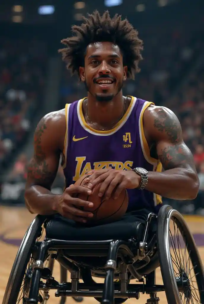 EllaHochdetailreiches und realistisches filmisches Bild eines Rollstuhl-Basketballers im Trikot der Los Angeles Lakers. Im Mittelpunkt stehen die Athleten, die in einem