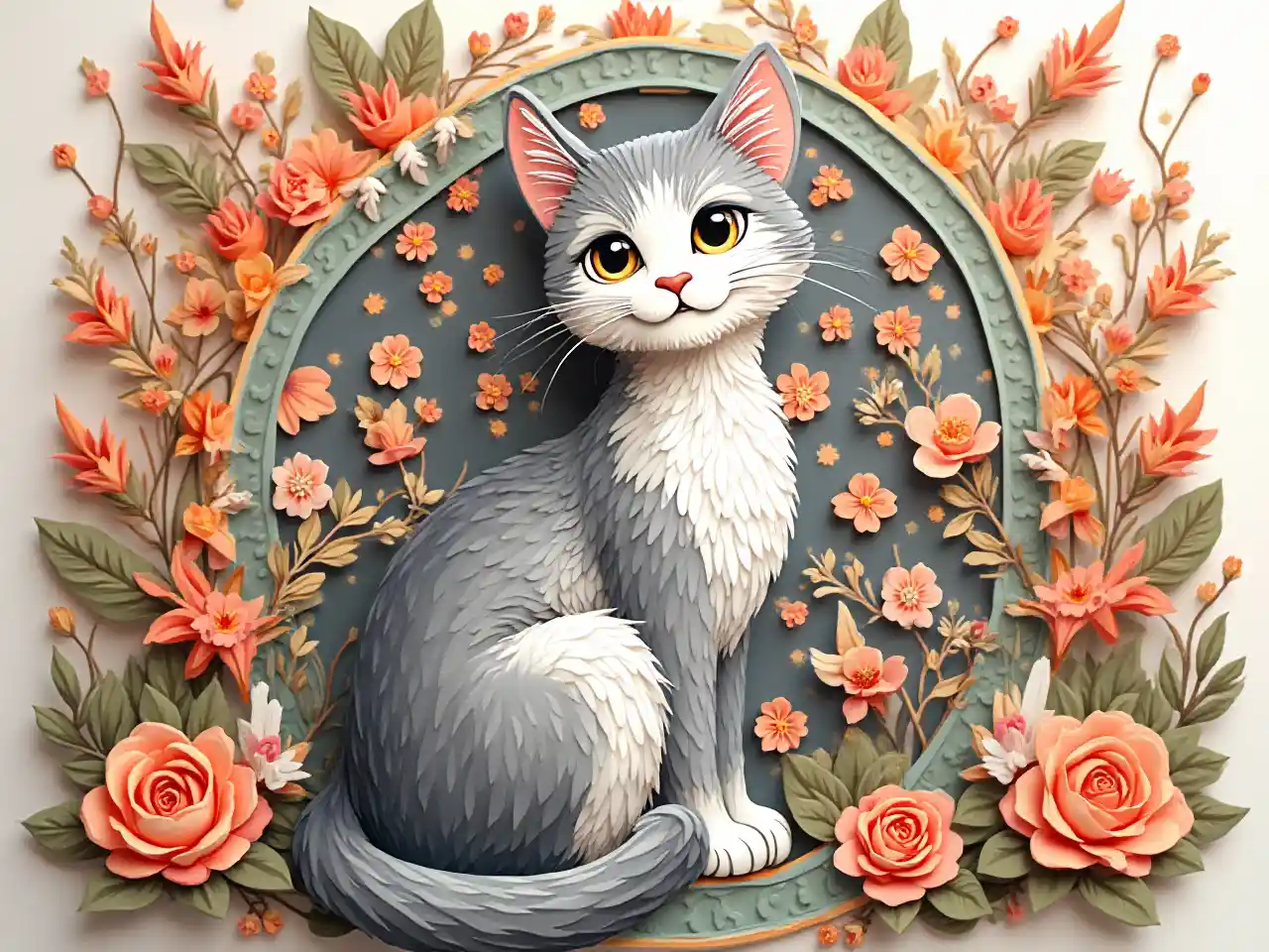 Entwerfen Sie eine anthropomorphe Katze Papierschnitt-Schichtstildiagramm. Die Katze ist als überlappende Scherenschnitte dargestellt, wodurch ein handgefertigter Look entsteht. Der Hintergrund besteht aus verschachtelten Motiven und floralen Motiven. Das Fell der Katze wird mit feinen Papierstrukturen wiedergegeben, die Augen sind hell und ausdrucksstark. Die Gesamtkomposition ist akribisch künstlerisch, mit Fokus auf Handwerk und Tiefe,