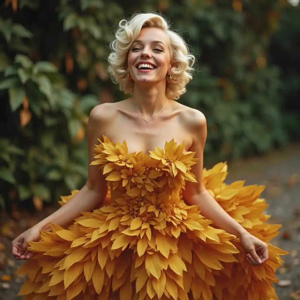 LeviMarilyn Monroe trägt ein flauschiges Kleid aus Blättern, ein glückliches Lächeln, leuchtend gesättigte Farben und einen hohen Kontrast