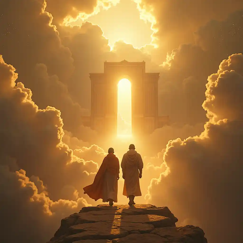 In einer spannenden Szene, die von Wolken und Nebel umgeben ist, schreiten zwei legendäre historische Persönlichkeiten zielstrebig zum Himmelstor, ihre Silhouetten sind mit einem leuchtenden goldenen Licht gefüllt und repräsentieren ihre ewige Reise. Die umgebende Architektur, die Erhabenheit des Osmanischen Reiches und die Eleganz der frühen Republikanischen Partei verschmelzen, als ob sie verträumt im Äther schweben und in die Ferne zu einem prächtigen Himmelstor führen würden. Die Figuren sind mit ultradetaillierten Gesichtszügen und lebensechten Ausdrücken dargestellt, in Kostümen einer bestimmten Epoche, die genau ihre legendäre Epoche widerspiegeln. Ein mysteriöser Heiligenschein umhüllt sie, und weiche, schimmernde Partikel schweben in der Luft und verleihen der Szene eine fast magische Qualität. Die Atmosphäre ist mit göttlicher Energie gefüllt, getaucht in ein dunstiges goldenes Licht, das Ruhe und Kraft ausstrahlt. Die filmähnlichen Lichter werfen dramatische Schatten und heben die komplizierten Details des Stoffes hervor, während die Komposition episch inspirierend bleibt und ein tiefes Gefühl von Ehre und Transzendenz hervorruft.
