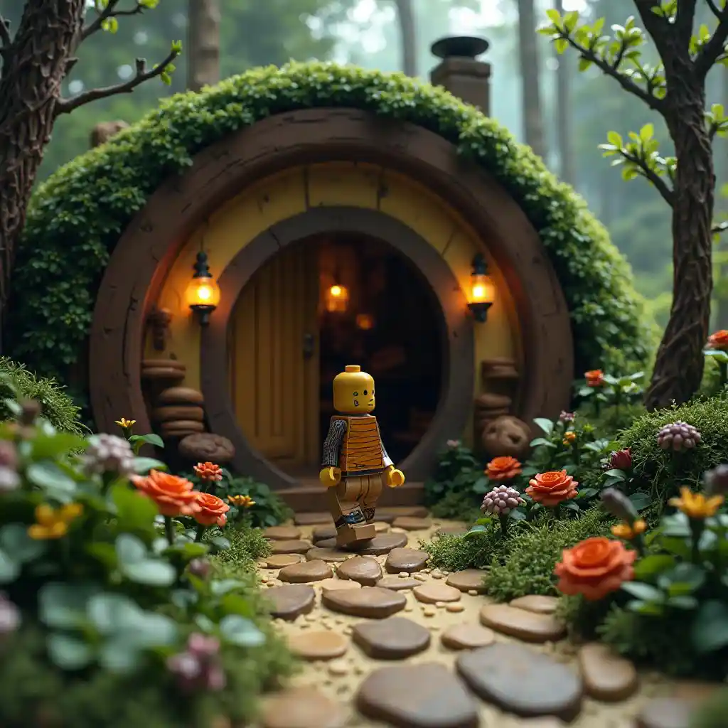 Die Kamera befindet sich auf dem Boden des Hobbit-Hauses. Ein Hobbit kommt aus dem Haus. Die Kamera ist weit von der Tür entfernt, aber Sie können sehen. Die Szene sieht aus wie ein Videospiel. Raytracking, aber realistisch und verträumt. Die Kamera ist im Haus. Auf dem Boden ist der Hobbit eine Lego-Minifigur, aber alles andere ist normal. Der Blick ist vom Inneren des Hauses, wir sind die Lego-Figuren vom Boden