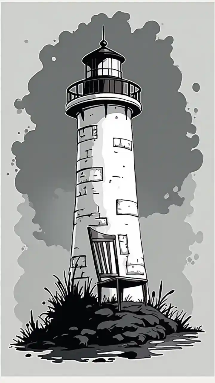 Machen Sie ein Logo für eine Theatergruppe. Die Theatergruppe trägt den Namen Lighthouse Theatre. Da ist ein Leuchtturm. Ein Lichtstrahl des Leuchtturms fällt auf einen leeren Stuhl auf der Basis des Leuchtturms Machen Sie es abstrakt, schwarz auf weiß