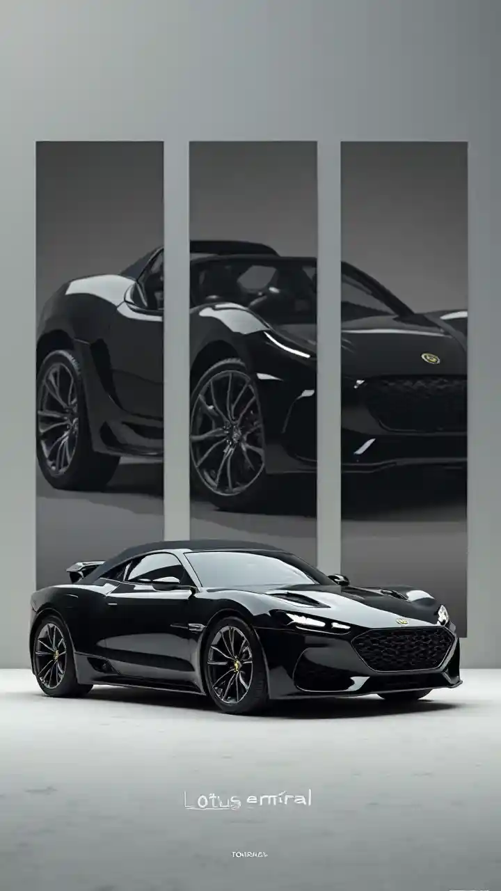 Ein luxuriöser schwarzer Lotus Emira 4cyl 'AMG-Sportwagen, sauberer Studiohintergrund, Seitenansicht an der Unterseite, drei vertikale Ausschnittplatten darüber, die Nahaufnahme von Heck, Rädern, Scheinwerfern, modernes minimalistisches Layout, kontrastreiche Lichter, weiche Schatten unter dem Auto, darunter die Marke Lotus Emira, Autowerbestil