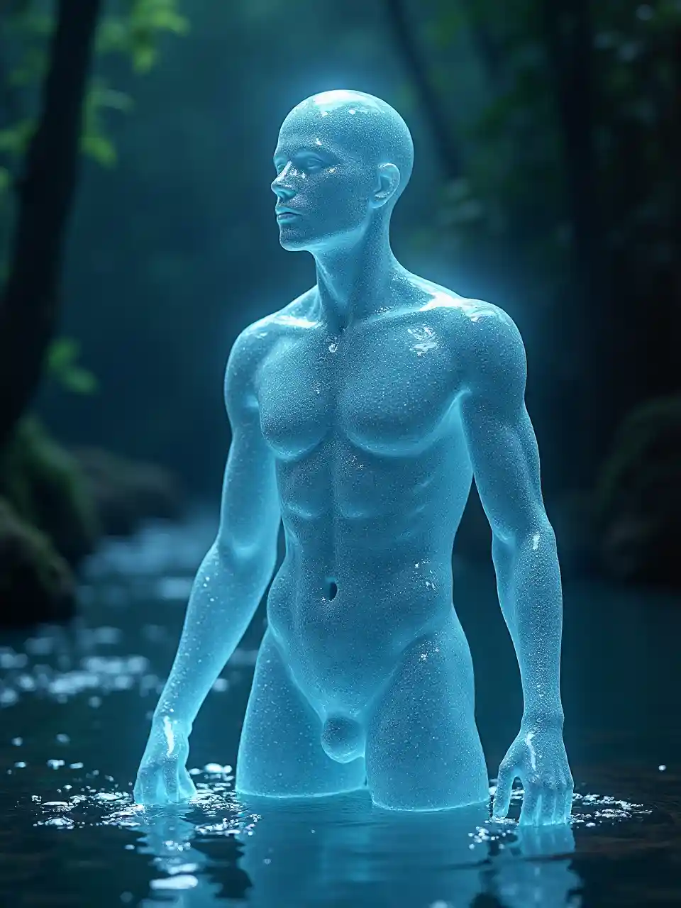 Detaillierte Fotos der menschlichen Figur von etwas völlig aus weltfremden leuchtenden und durchscheinenden flüssigen Materialien, auf der nächtlichen Dschungeloberfläche können Sie das gesamte Innere seines ganzen Körpers sehen, übernatürlichen Stil, realistischen Stil, unendliche Ultra-High-Definition-Bildqualität und Rendering, unendliche Bilddetails, unendliche realistische Renderings, unendliche realistische globale RTX-Beleuchtung, unendliche Spezialeffekte