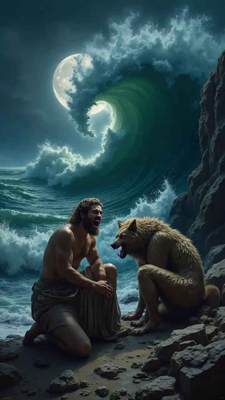 In einer dramatischen, mondlichtigen Szene wird die schreckliche Verwandlung des legendären Arcadia-Königs Lycaon und dessen ein oder zwei Söhne als Zeus 'Strafe zum Werwolf dargestellt. Im Moment der Metamorphose wird Lycaons Körper verzerrt, das Gesicht zu einer Nase gestreckt, die Haut zu Fell verdickt und ein Heulen ausgelöst. Seine Söhne, ebenso gequält, kauerten neben ihm, ihre Körper waren verzerrt und in beängstigende Formen verformt. Im Hintergrund schlägt eine riesige, schaumige Welle auf die felsige Küste und symbolisiert den Zorn der Götter. Das dunkle, turbulente Wasser der Wellen scheint das Chaos und die Unruhe widerzuspiegeln, die sich an Land entfalten. Lycaons Gesicht, einst grausam und unreligiös, verzerrt in einer Mischung aus Wut und Angst, seine Augen schimmern mit weltfremder Intensität. Die Atmosphäre ist dunkel, ominös, eine unheilvolle Vorahnung, und das einzige Licht vom Vollmond hängt am Himmel und wirft ein düsteres Licht auf den Holocaust.