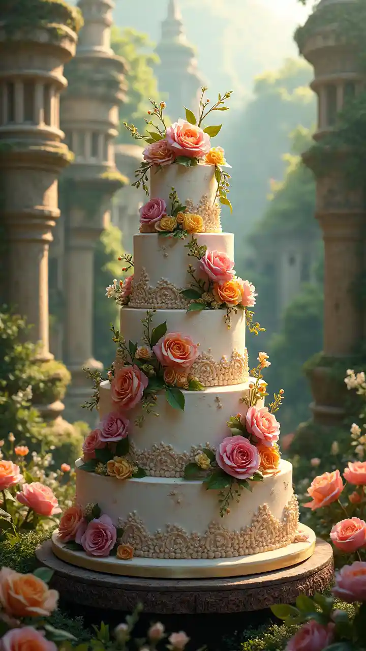Bezaubernde Hochzeitskuchen, exquisite Blütendesigns, satte Farben, mehrschichtige Texturen, eine Reise durch die antike Weltlandschaft voller mysteriöser Relikte und sanftem goldenem Licht. Vor dem Hintergrund von üppigem Grün und bröckelnden Tempeln werden die lebendigen Töne und romantischen Nuancen des Kuchens betont. Schaffen Sie eine wunderbare und nostalgische Atmosphäre, um ewige Momente einzufangen. Ultradetaillierte, hochwertige Kunst, die das Gefühl eines magischen Abenteuers hervorruft.