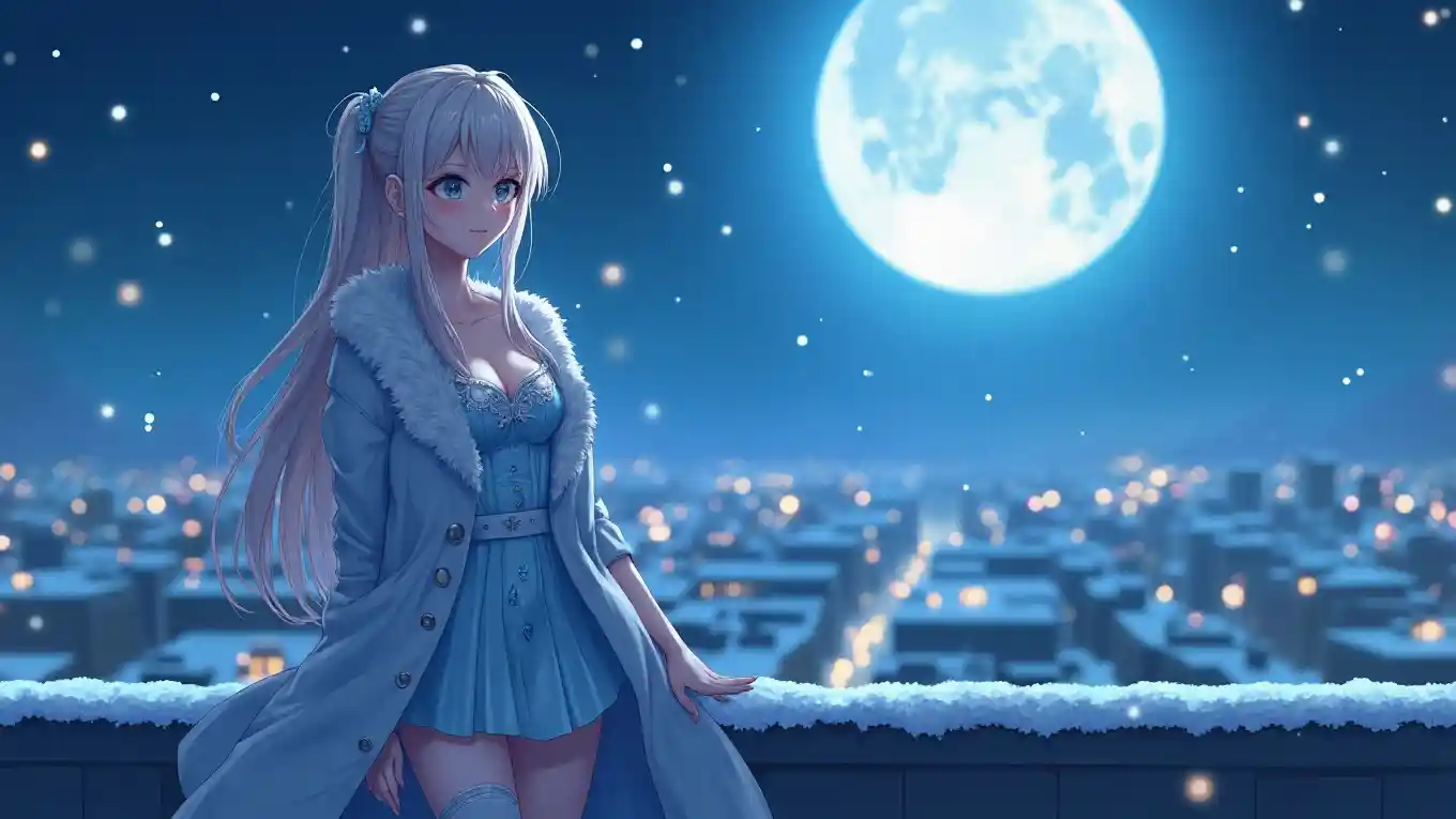 Das horizontale und großformatige Ultra-High-Definition-Anime-Mädchen, strahlend, atemberaubend und magisch, der Vollmond scheint, steht auf dem schneebedeckten Dach im Freien, darunter die Lichter der Stadt, trägt einen Pelzmantel und trägt einen tief hängenden Ausschnitt Kleid und schenkelhohe Seidenstrümpfe, lange Haare mit Frost und friedlichem Lächeln, breite und glänzende Augen, strahlende Haut, kalte Blau-Silber-Palette, exquisite Gesichtszüge, makelloses Make-up, magische und romantische Atmosphäre, Das sanfte Licht und die atmosphärische Beleuchtung unterstreichen ihre elegante, klar konzipierte Brust und ihr dezentes Dekolleté sowie ihre ruhigen langen und durchtrainierten Beine, die Mysterium und Schönheit ausstrahlen.