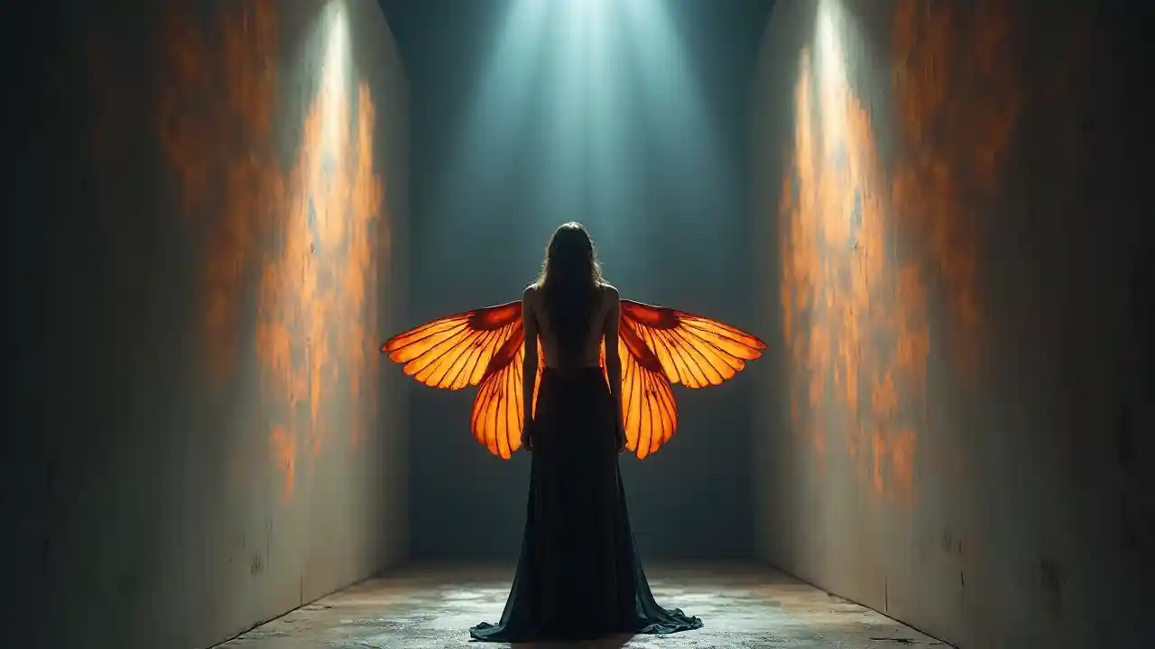 Ein surrealistisches Fantasy-Werk mit einer Frau mit orangefarbenen Flügeln als Hauptfigur