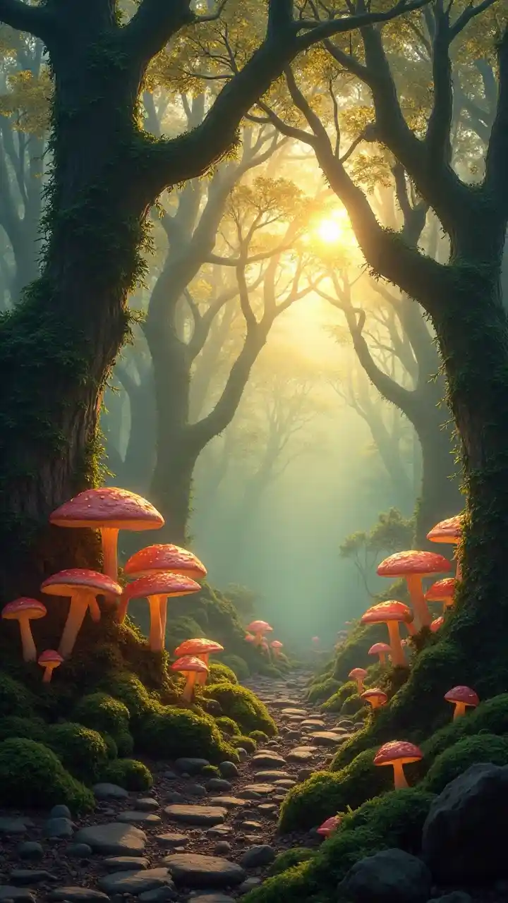 Im Morgengrauen ein magisches mittelalterliches Waldpanorama, leuchtende Pilze, alte Bäume voller Moos, bezaubernder Nebel, goldenes Licht durch die Krone, Details und Fantasieumgebungen, keine Figuren, keine Kreaturen, keine Menschen, Malstile, Filmbeleuchtung, mystische Atmosphäre, nur fantastische Landschaften, --ar 17,6