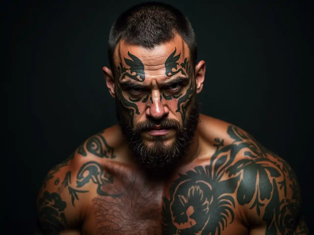 CamilaStarkes und muskulöses Porträt eines gebürtigen Neuseelands mit entmutigendem Gesicht, Gesichtstatoos, abgesetzten Farben, Set-Fotos, professionellen Fotos, satten Farben, detaillierten Bildern