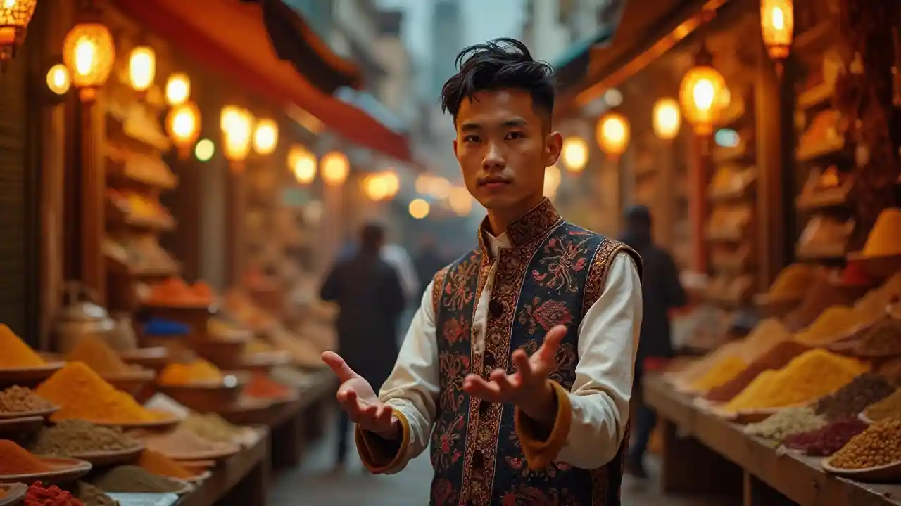 Bei einem Spieltrick auf einem marokkanischen Festplatz strahlt ein 25-jähriger asiatischer Mann in einer bestickten Weste. Gewürzstände und Laternenlaternen umrahmten ihn, und seine charmanten Tricks und flinken Finger verströmten Charme und Mysterium in einem lebendigen und belebten Markt.
