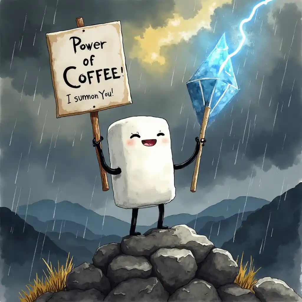 Oben eine große Marke „Die Kraft des Kaffees! Ich rufe dich! "Der obige Text wird überlagert. Das Aquarell zeigt eine heitere, anthropomorphe Figur der Zuckerwatte, die triumphierend auf einem dunklen Felsvorsprung bei einem sintflutartigen Regen steht. Marshmallows halten fröhlich einen Holzstab hoch, mit einem riesigen, leuchtenden blauen Kristall auf der Oberseite, der auf einen dramatisch bewölkten Tag hinweist. Ein heller Blitz erleuchtete die Einsatzstelle nach unten aus einer regnerischen Wolkendecke in der Nähe des Personals. Die sanften Hügel bilden die Kulisse unter stürmischem Himmel. Bei dem Bild handelt es sich um ein Gemälde im Aquarellstil, das eine skurrile dramatische Szene darstellt. Die zentrale Figur ist eine fröhliche, anthropomorphe Zuckerwatte. Er ist weiß, zylindrisch und steht mit zwei schlichten schwarzen Beinen aufrecht. Es hat einen schwarzen Stabarm, seine Gesichtsmerkmale sind geschlossen, seine nach oben gebeugten Augen und sein Lächeln mit offenem Mund vermitteln Aufregung oder siegreiche Anstrengung. Marshmallows stehen prominent auf einem dunkelgrauen, zerklüfteten Gesteinsbündel. In seiner rechten Hand hält er ein braunes, holzähnliches Notenband hoch. Die Spitze des Personals ist ein großer, leuchtender, facettenreicher blauer Kristall, der leuchten kann. Der Hintergrund zeichnet eine stürmische Landschaft. Durch die Ferne ziehen sich sanfte Hügel oder Berge unter einem turbulenten Himmel voller schwerer, dunkelgrauer und leicht gelber Gebirgswolken. Besonders auf der linken Seite des Gemäldes ist der Regen deutlich nach unten geritzt. Rechts aus den Wolken in der Nähe, auf die der Kristallstab hinweist, kratzt ein gezackter weißer Blitz durch den Himmel und erhellt die Wolken um ihn herum. Die Gesamtatmosphäre ist dramatisch und kontrastiert dunkle Stürme mit hellen Blitzen und leuchtenden Kristallen mit der fröhlichen Entscheidung des Marshmallow-Charakters. Der Vordergrund besteht aus felsigen Plattformen mit einigen lichten, braunen Gräsern oder Vegetation.
