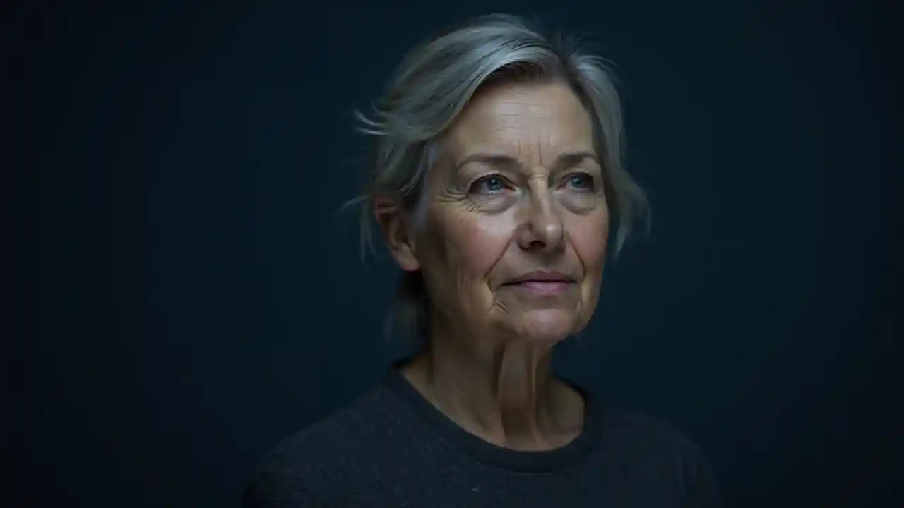 Frau mittleren Alters auf dunkelblauem Grund