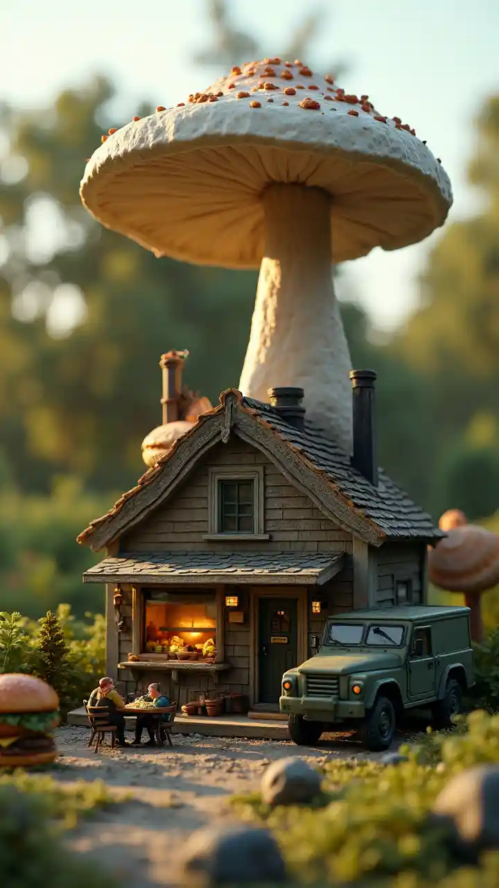 Eine hochrealistische Miniatur-Modellszene, die im dämmerlichen Tageslicht aufgenommen wurde und durch ein großes, detailreiches Haus unter einem riesigen Pilz gekennzeichnet ist, der direkt vom Dach wächst. In einem beschaulichen Außenhof wurde ein teils sichtbarer, aus einem Militärfahrzeug umgebauter gepanzerter Hamburger Truck aufgestellt. Das Haus ist von kleinen Tischen und Stühlen umgeben, Miniatursoldaten sitzen und essen genau das gleiche Essen wie Burger, Pommes und Getränke auf Lastwagen. Hinter dem Haus ist eine riesige, superrealistische Schnecke schwach sichtbar, die leicht unscharf wirkt und der Komposition ein mysteriöses Element hinzufügt. Alles sieht aus wie ein winziges, detailreiches Modell, das mit einer Makrolinse aufgenommen wurde und eine filmähnliche Tiefenschärfe, ultradetaillierte, realistische Beleuchtung und Fotografie im Diorektostil verleiht.
