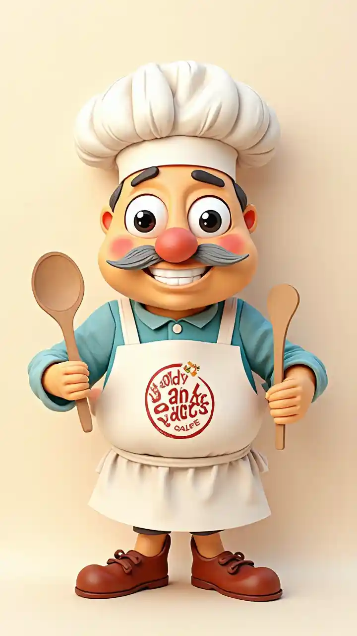 Scherenschnittverfahren Illustriert Mr. Smile Knoblauch ist ein heller Knoblauch mit ausdrucksstarken großen Augen und einem warmen Lächeln. Er trägt einen grauen Oberlippenbart, der ihn weise und erfahren erscheinen lässt und an einen "Papa" erinnert, der alle Geheimnisse der perfekten Soße kennt. In einer weißen Schürze mit dem "Papa Sauce" -Logo auf der Vorderseite hielt er einen Kochlöffel in der Hand und bereitete sich darauf vor, einen Topf mit köstlicher Soße zu rühren. Seine muskulösen Arme zeigen, dass er viele Jahre damit verbracht hat, seine eigenen Rezepte zu perfektionieren. Tragen Sie einen Kochhut auf dem Kopf und fügen Sie die Aura eines Experten für die Saucenherstellung hinzu