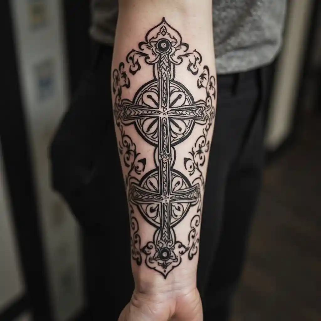 Kannst du mir einen Arm machen Ta moko mit einem Kreuzmuster in der Mitte, das für Kraft, Mut, Mut und einen Neuanfang im Leben steht → Kannst du es vom Handgelenk bis zum Ellenbogen männlicher machen → Mach mir ein Ta moko-Tattoo, das symbolisiert meine Liebe zu meinen beiden Söhnen, meinen Kampf gegen die Sucht und meinen Glauben an die Freiheit