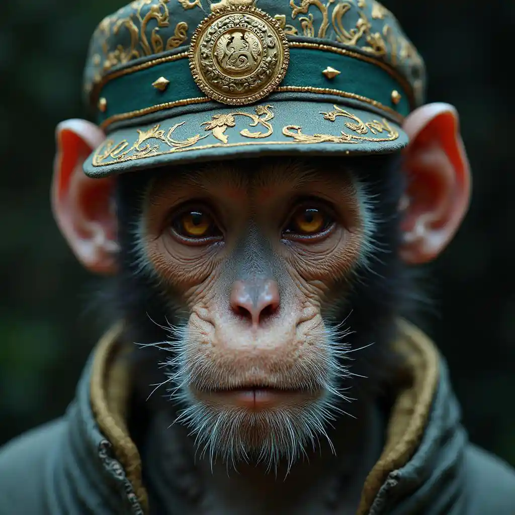 Affen-Nahaufnahme mittleren Alters mit vollem Gesicht, nur mit türkischem Nationalhut, Hintergrund wird in Zukunft das Hightech-Netzwerk Punk Turkmenistan sein