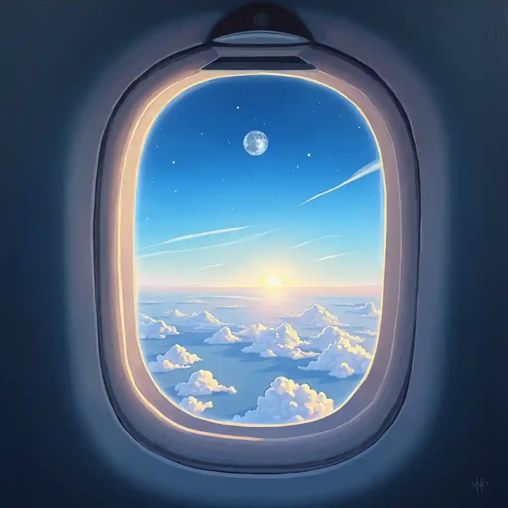 Erstellen Sie Ultra-High-Definition, 64K, professionelle Ölgemälde. Dargestellt, an einem sonnigen Tag fliegen und aus dem Flugzeugfenster schauen, das Mondlicht verleiht den Objekten darunter eine Art Mittagshimmel,