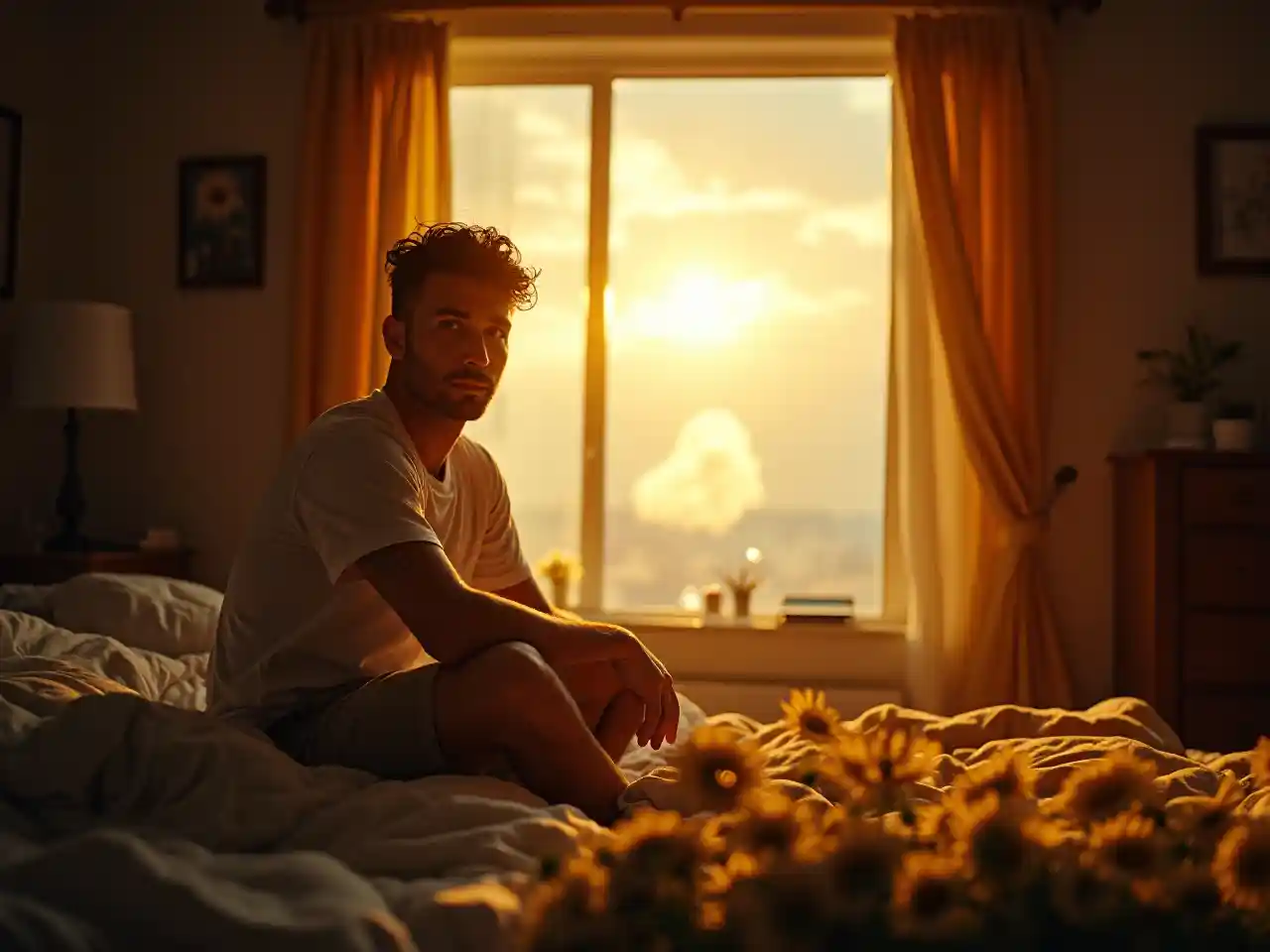 Die Atombombe explodierte, die Endzei-Morgensonne strömte durch das Schlafzimmerfenster und erleuchtete einen Mann mit spanischen Wurzeln Anfang 30, der friedlich am Bett saß. Er blickt direkt in die Kamera, seine Augen sind voller Vorfreude auf diesen Tag. Das Objektiv ist filmisch und ultra-realistisch, hat natürliche Farben, ist hinterleuchtet und wurde auf dem Kodak Gold 400-Film aufgenommen. Das warme Licht sorgt für ein sanftes Licht um ihn herum und verstärkt die ruhige, jederzeit kuschelfähige Alltagsatmosphäre. T, das Mädchen pflückt ein Gänseblümchen im Vordergrund