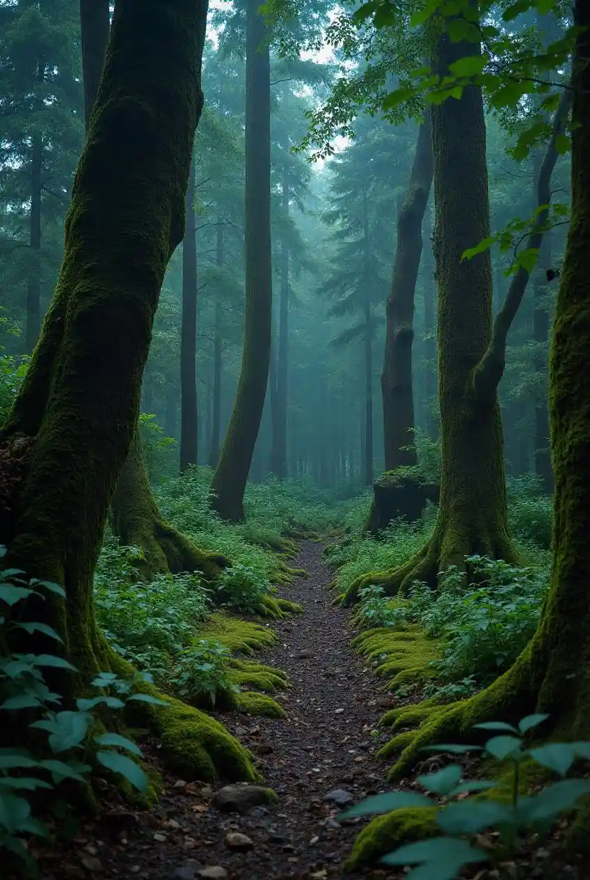Moosbedeckte Wälder mit alten Bäumen und von Glühwürmchen beleuchteten Böden.