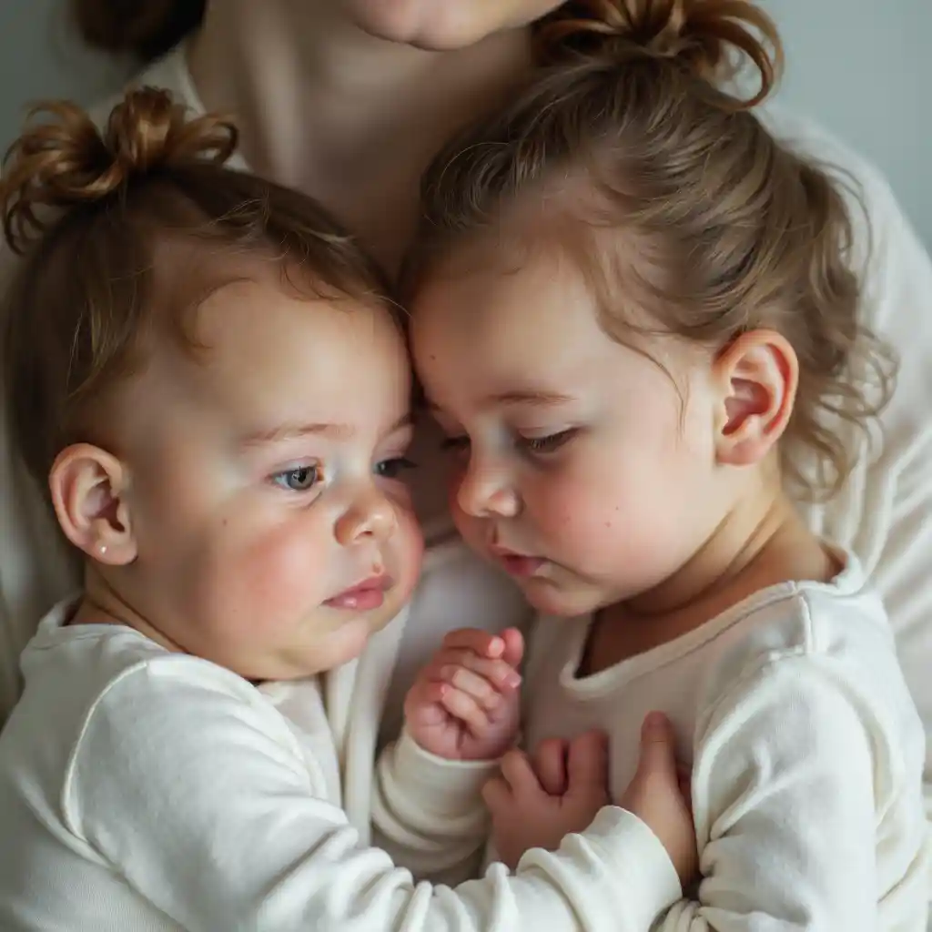 Ein atemberaubendes Detail (((Mama und zwei eineiige Zwillinge an ihren Beinen)), begleitet von einem unverwechselbaren Porträt in Nahaufnahme, strahlt hochwertige Schönheit aus. Ihre blassweiße Haut ist mit zarten Sommersprossen übersät, die sich harmonisch in ihr gesamtes Hautbild einfügt und eine friedliche Atmosphäre schafft. Die Zwillinge haben Mischlingsblüten, die in hellen und cremeweißen Tönen zu den Tönen ihrer Mutter passen und faszinieren. Sie versammelten sich um sie, wo sie eine innere Bindung bildeten, die das Äußerste der Intimität widerspiegelte. Die Szene ist weich und einladend und unterstreicht die natürliche Schönheit der Familiendynamik.