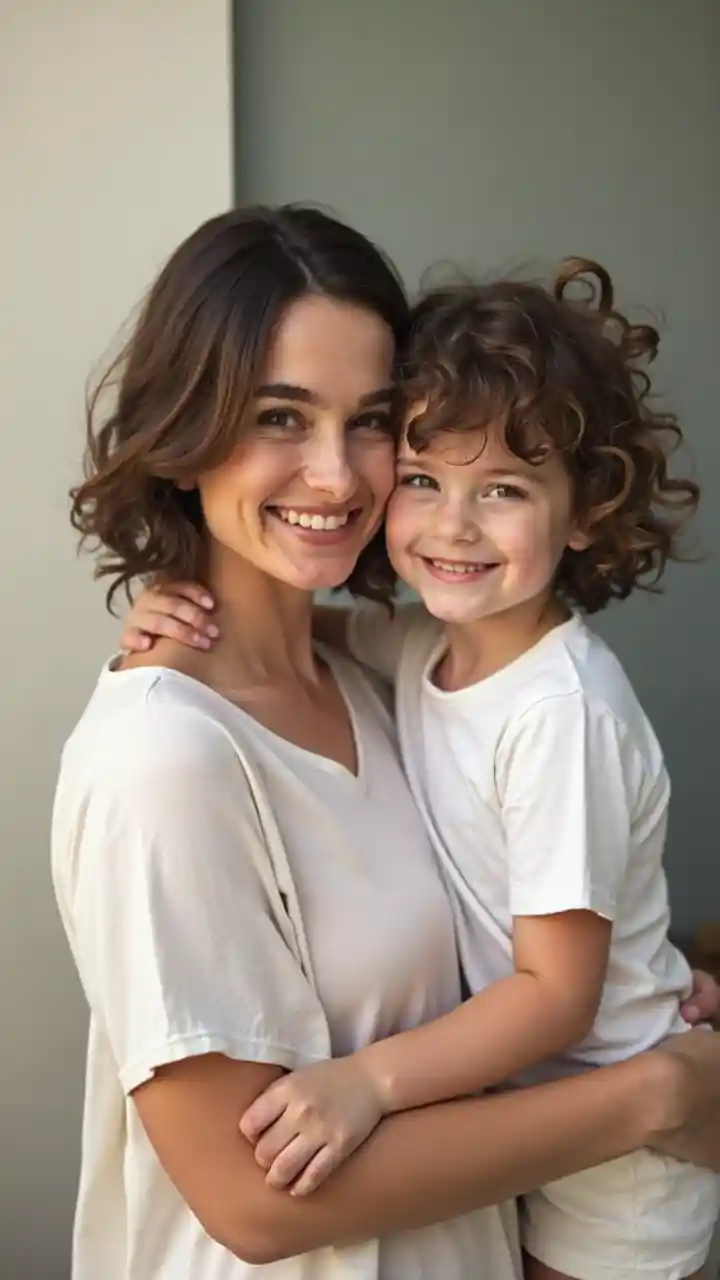 ElijahFrau trägt weißes T-Shirt, Tochter hält sie und lächelt