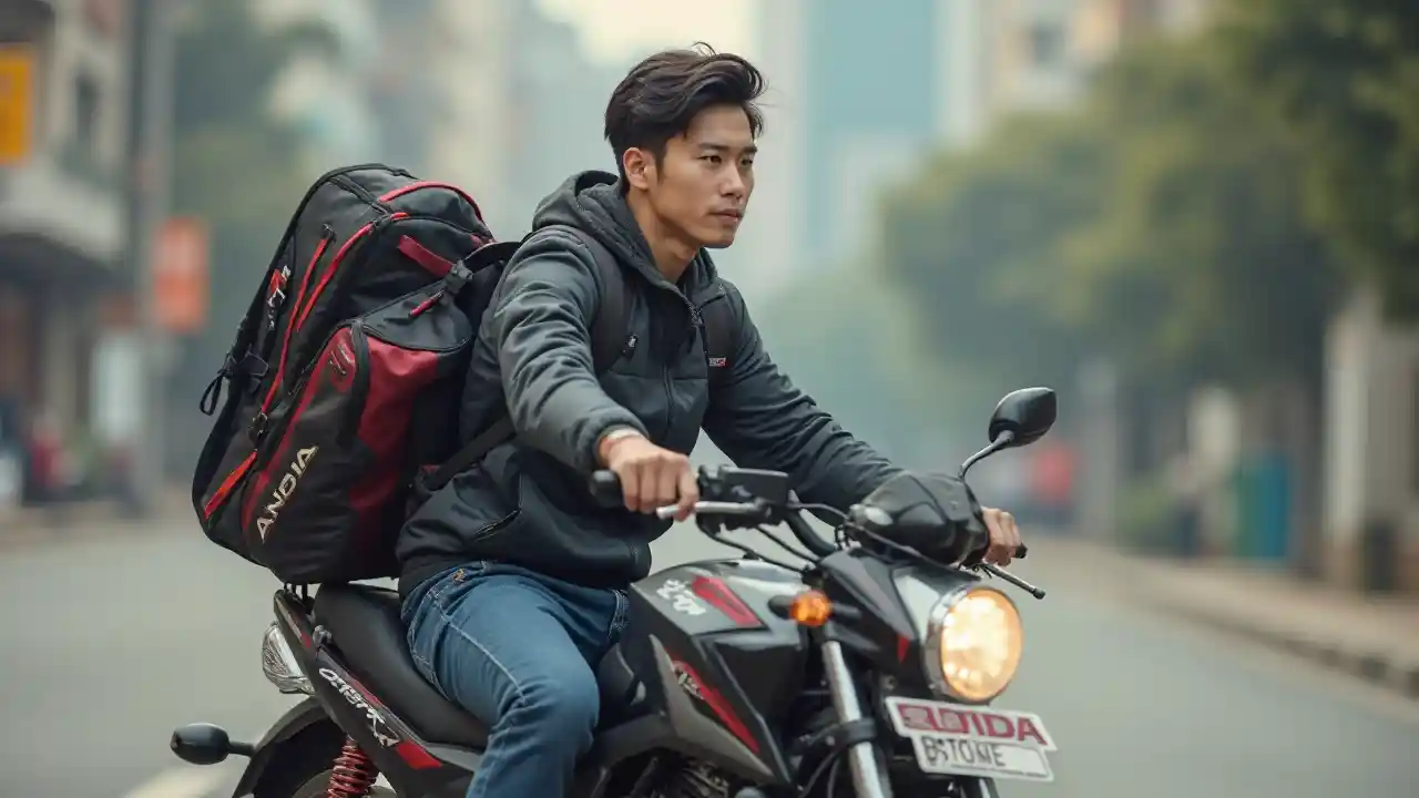 Ein junger Mann auf einem Motorrad der Marke Honda Sonic, bekleidet mit einer Ansor-Jacke und einer Badmintontasche