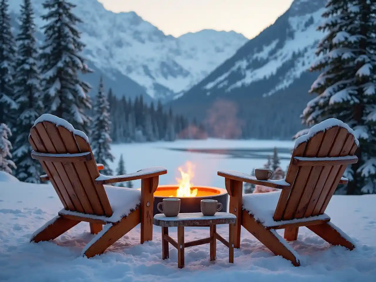 Zwei Stühle blicken in die Landschaft der Berge. Vor den beiden hölzernen bequemen Stühlen brennt ein offenes Feuer im Löschteich, auf der rechten Stuhlarmlehne befindet sich eine dampfende Tasse Schokolade. Die Stühle sind Richtung Berg aufgestellt, die Berge sind mit Bäumen bepflanzt. Die ganze Szene ist von Neuschnee bedeckt und schneit noch. Zu sehen sind in der Ferne zahlreiche Bäume und ein schneebedeckter, zugefrorener See. Kaum ist die Sonne untergegangen, wird es etwas dunkler.