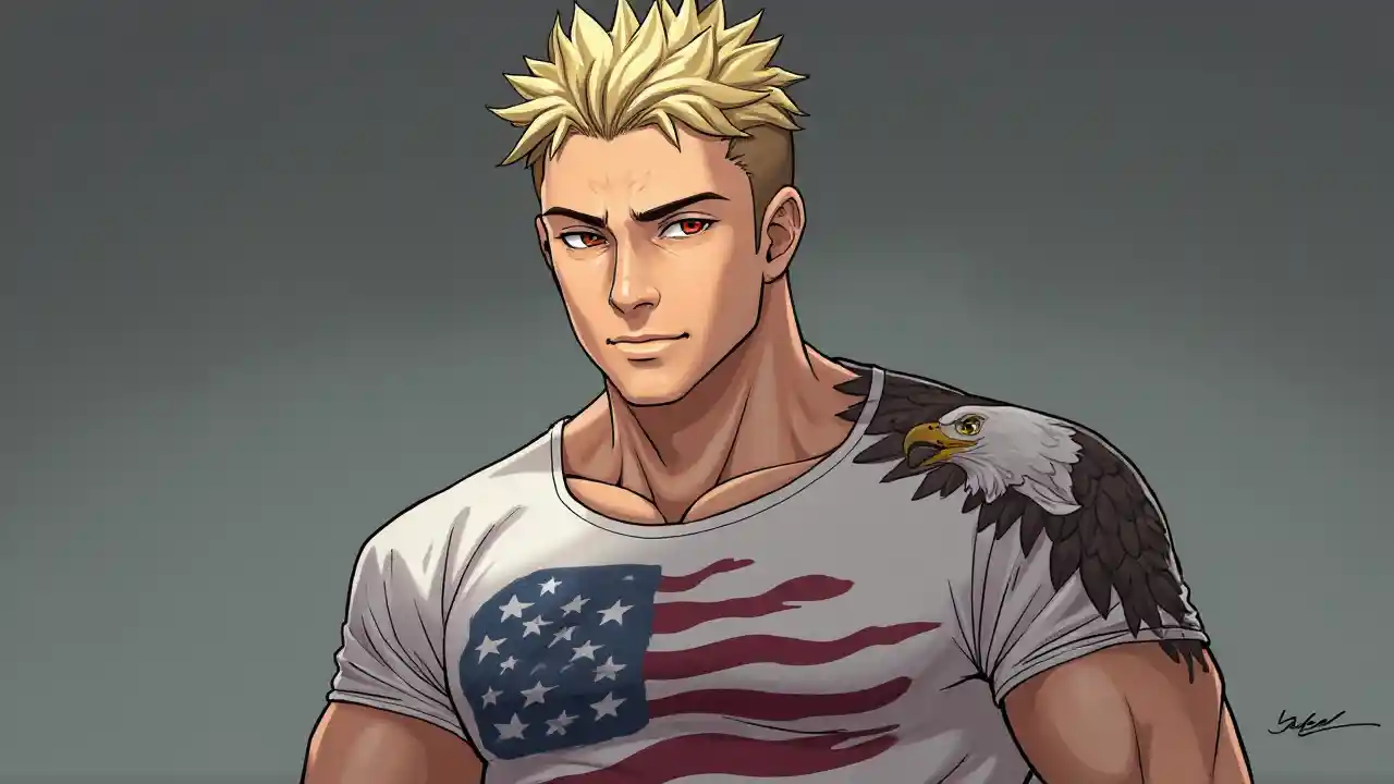 Ein Anime-Style-Porträt eines blonden, kurzhaarigen und muskulösen Mannes, der der Kamera zugewandt ist. Bekleidet mit einem T-Shirt mit US-Flaggenmuster. An den Schultern sind Adler-Tattoos zu sehen.