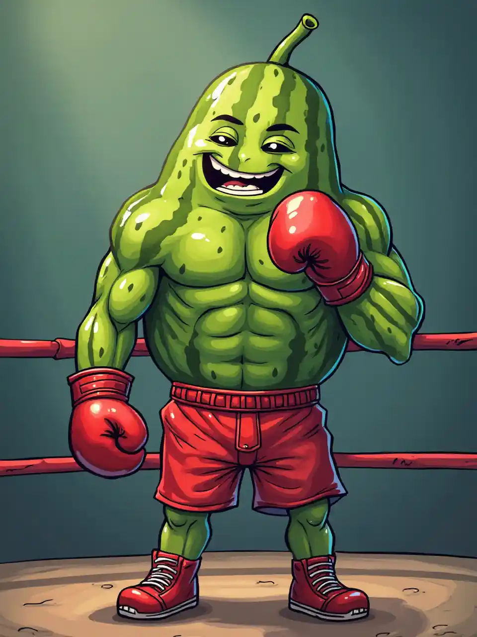 Cartoon-Illustration der muskulösen Wassermelonen-Figur, die in einem Boxgerät im Ring steht