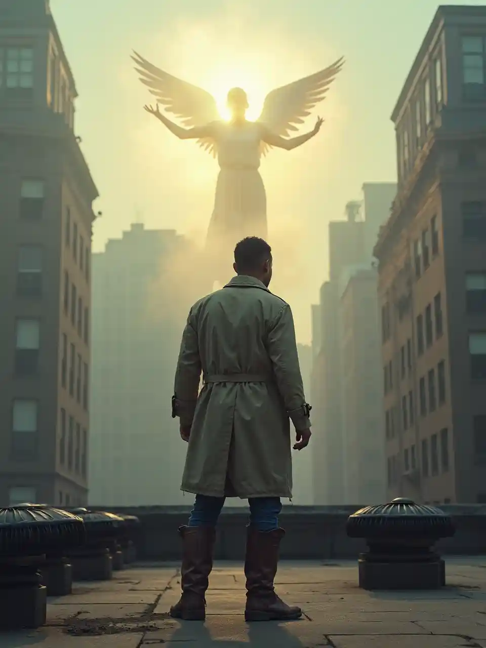 Die Rückenperspektive eines Mannes in unvollkommener Kleidung, schäbiger Windjacke, hohen Stiefeln und unfestem Schnürsenkel, der auf dem Dach eines Gebäudes in New York steht. Er war umgeben von einem Turbolüfter auf dem Dach. Der Mann stand schockiert, Arme und Beine auseinander, starrte nach oben auf einen leuchtenden Engel, umgeben von einer strahlenden Aura, blickte auf ihn herab und gestikulierte. Schneelichter. Dünner Nebel. ätherische Atmosphäre.