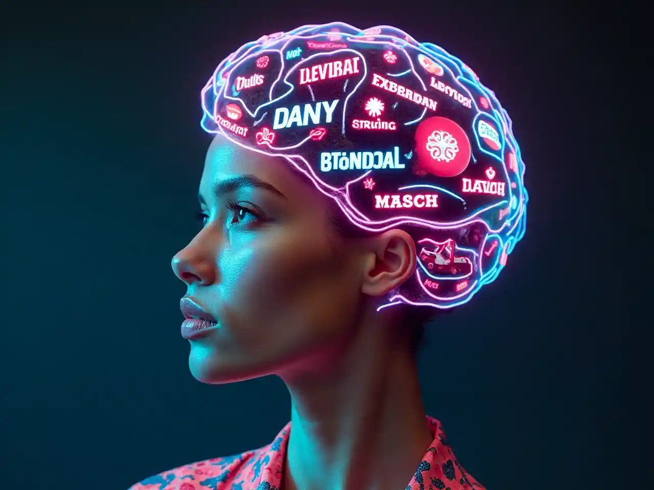 Kompliziertes Neon-Gehirn-Design, das Mode und Konsumkultur integriert